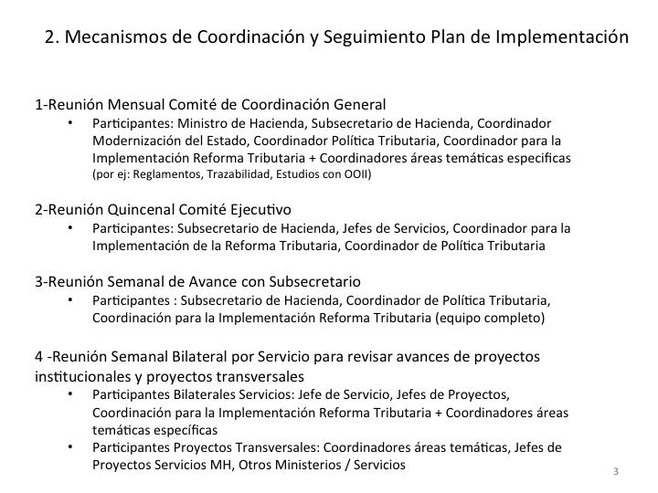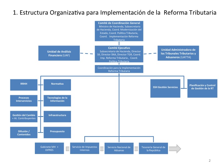 Si bien se trabaja directamente con los servicios de Impuestos, Aduanas y Tesorería, hay otros estamentos que también se ven involucrados. Por ejemplo, el Ministerio de Transporte y Telecomunicaciones y el Registro Civil para el caso de los impuestos a los vehículos nuevos; Cochilco para el tema del programa de control a las exportaciones mineras; las superintendencias de Valores y de Bancos y el ministerio de Economía en el caso de definición de nuevos instrumentos de incentivo al ahorro; y el Comité de Inversiones Extranjeras para lo que tenga que ver con las modificaciones del DL 600. Eso por nombrar algunos servicios del Estado porque la lista es larga y la implementación comenzó el 1 de octubre y continuará hasta el 2018.
