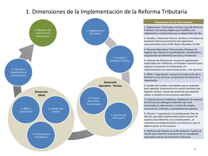 Paralelamente, se delinea la adecuación de los procesos operativos y sistemas de información de los servicios involucrados. El más crítico es el del Servicio de Impuestos Internos puesto que existe el diagnóstico de que la plataforma que sustenta la operación renta es más moderna que la del IVA. A esto se suma la necesidad de actualizar los programas que existen a la nueva información que se requerirá, lo que resulta complejo cuando se tiene que convivir con tres regímenes tributarios: el que rigió hasta el 1 de octubre, el de transición y el permanente a contar de 2018.